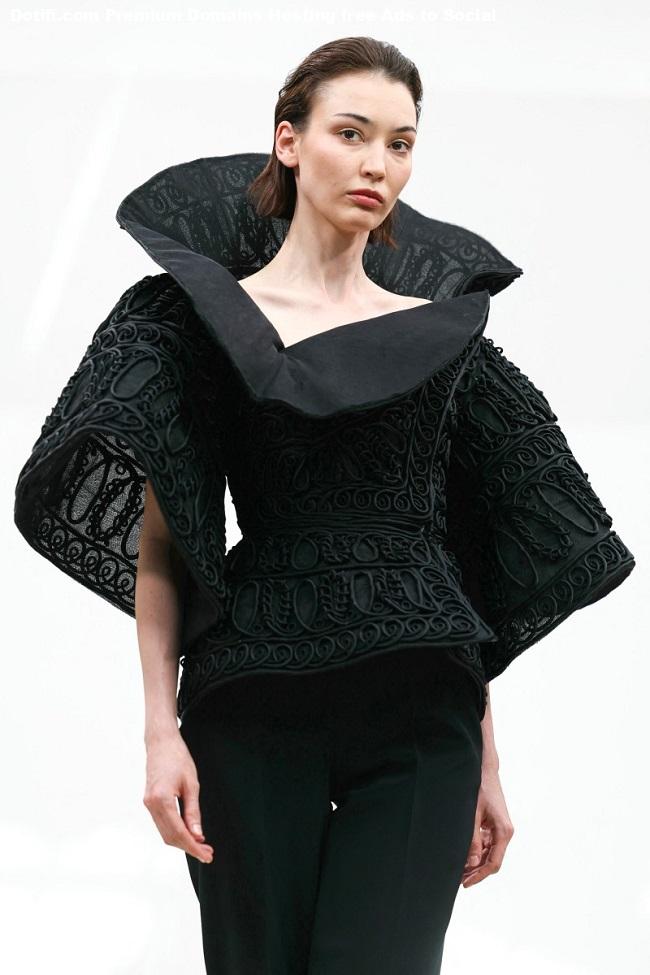 The next day, she turned heads at Stephane Rolland, with a sculptural black headpiece that surrounded her like a religious shroud.